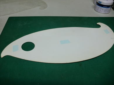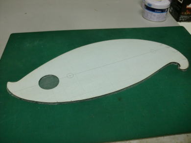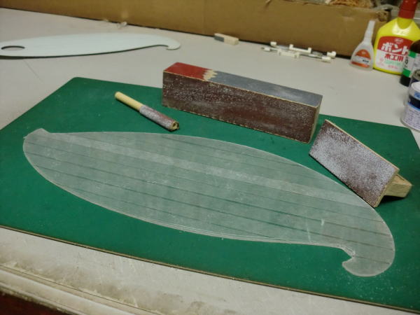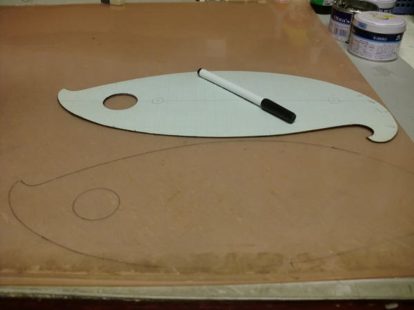 ● 此れを切り抜くと画像の様な厚みのある形紙に成るんですなあ・・・。此の市販の雲形定規が透過浸透性のある透明だったり半透明なのにはちゃんとした理由が有りまして・・・。実際に使ってみれば解る事なんですが、胴体の上面図は胴体の中心から見れば左右は対称・・・。目盛りを入れるのに鉛筆で記しを入れた場合、半透明(もしくは透明)ならば定規を裏返しても記した位置が見えるので同じ位置に正確にラインが引ける利点があるんです。