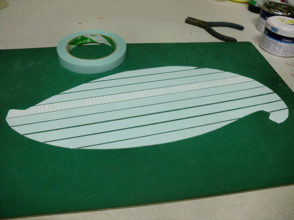 ● さてっと!・・・大雑把に切り抜いて貼り付けた雲形定規の部材・・・。此処からちきっとシビアな工程です。今度は形紙がズレると取り返せないレベルの傷が入るので、形紙自体がズレない様に両面テープを貼って対策します。余裕は2~3mm程度しか無いですしね・・・。