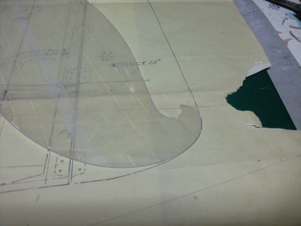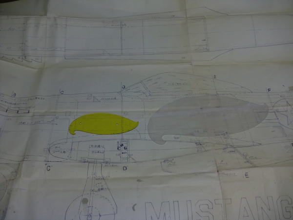 ● 私の靴のサイズよりもデカいムスタングのラダー・・・アールの一部が見事にフィットしてますなあ・・・。このフィット感がトレースする時に大いに役立つんですなあ・・・。両面テープが間に挟まった二枚貼り合わせの雲形でも、図面に記入された文字類がはっきりと見えるでしょう?。此れが重要なんですよ~・・・。