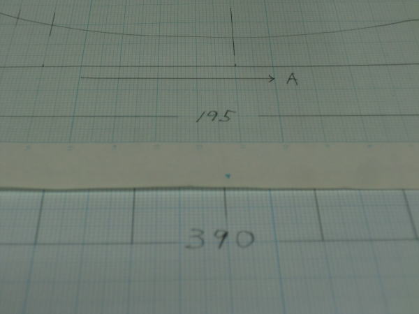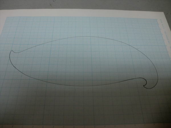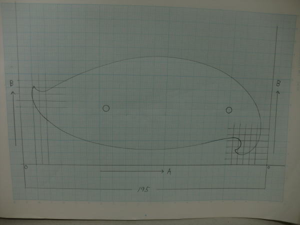 ● (B5)の方眼紙に作図した雲形定規の周囲の形状ですが、座標取りの為の基準線は195mmとしました。此れを今度は(A3)の方眼紙に二倍のサイズ390mmで記入しましょう。二倍に拡大するって事は、雲形定規の長さだけを増やすって事じゃないですよ。幅も二倍にするって事です。よって5mm四方で作図した元図なんですが、拡大する時は10mm四方の交点で記載して行けば二倍に拡大した事になります。模型飛行機を専門誌の縮小図面から原寸サイズに戻す作業で、ネット物知り博士が失敗する事・・・。スパンだけを二倍にしてコード(翼弦)は其のまま(笑)・・・。直接材料に記入して組み上がったスチレンベースのプロフィール機は・・・あれま!・・・専門誌の機体とは似ても似つかぬ不思議な飛行機に成っちゃってましたねえ・・・。それでも「凄いですねええええ・・・。」とお仲間の博士さんからの驚嘆言葉の応酬・・・。不思議な博士集団だな~って思ってる大御所さん達多数。飛行場での話のネタにされてましたよ~(笑)・・・。