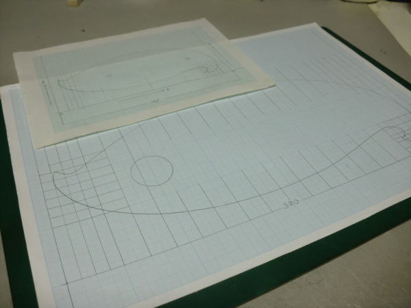 ● 拡大した自作雲形定規・・・見事に周囲のアールが全て二倍で描けてますなあ・・・。周囲の小口は400番位の耐水ペーパーで磨きを入れるとツルツルになるので、ラインが引き易くなります。昨日思い立って作図して・・・今日の同時刻には完成してます。アナログ作業にしては及第点でしょう(笑)・・・。