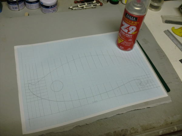 ● お次はこのペラペラの方眼紙を厚みのある雲形形状にします。文房具店で購入可能な厚紙にスプレー糊で貼り付けています。作図した方眼紙がしわに成らない様に貼り付けて下さいね。