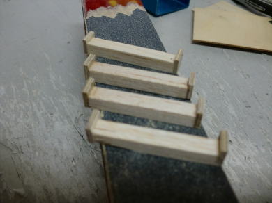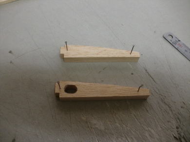 ● 画像はインナーウィングを左右繋ぐ為のベニヤのカンザシです。厚さが2mmあります。このカンザシにはピアノ線を埋め込みます。模型店で購入出来るロッドアジャスターのセットは、金属製のねじ切りロッド棒の先に樹脂製のアジャスターが付属しています。このアジャスターを必要分の長さで切って、このカンザシの溝にエポキシを使って埋め込みます。