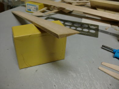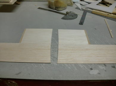 ● 基本的に・・・アウターウィングで上反角無しの0度設定にしたいのであれば、このスペーサーリブ二枚分の角度を、インナーウィングの片翼分の上反角設定にすれば上反角無しの主翼が組み上がります。もし・・・外翼で2度の上反角が欲しい場合は、インナーウィングのベニヤカンザシの片翼分の上反角に2度分を加算して、部材を切り出せば良いです。