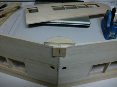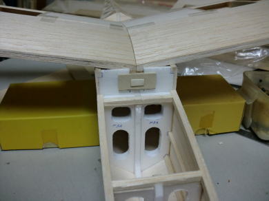 ● インナーウィングは結合する前に、パイロットのヘッドレストになる部分を予め作っておきます。Ⅰ型(初号機)は基本四角胴体・・・Ⅲ型(後期型)は六角胴体ですが、このヘッドレストの工作法はどちらも共通です。Ⅲ型機は色んな特別仕様が有りますが、このⅢ型の別仕様機は、新たにヘッドレストの部材を貼り込んでからカンザシで繋ぐ構造ですが・・・。Ⅲ型の初号機ではインナーウィングの結合後、プランクシートの上から部材を貼り込みヘッドレストを作りました。