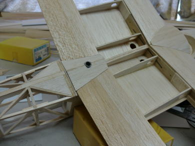 ● 本機のエルロンサーボは、ハッチ側にマウントを組んで主翼に取り付ける為、ビス止め用の台座を作ります。画像では既に上面側のプランクが済んだ状態で台座が組み込まれていますが・・・。作業工程は先にビス止め用の台座をリブの四隅に貼り込んで、翼の上面から補強の角材がはみ出ている時は、翼型に沿って削ってからプランクシートを貼り込みます。作業手順としては、此方の方が楽だと思います。