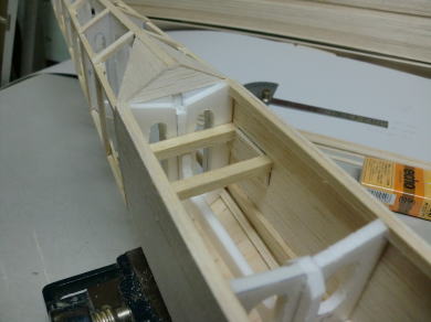 ● 便宜上・・・胴体に組み込んでの説明なんですが、実際は定盤の上に主翼だけを固定して片翼ずつ接着します。結合面の翼型は、インナーアウターどちらも同じです。画像の様にクリップ二つでリブを挟み、エポキシを塗り込んで圧着します。両面とも完全なる平面で仕上がっていれば、隙間が出る事はありません。