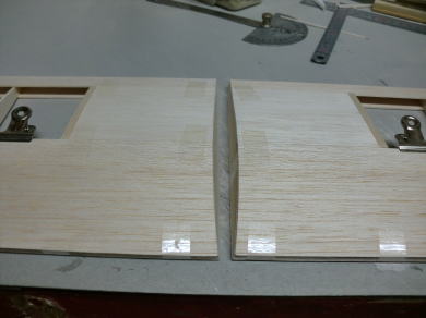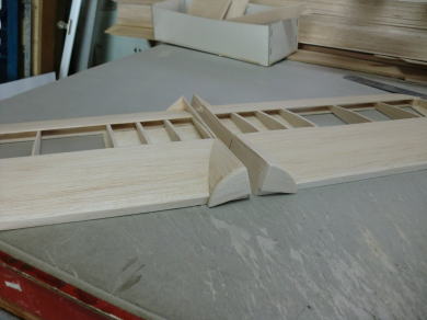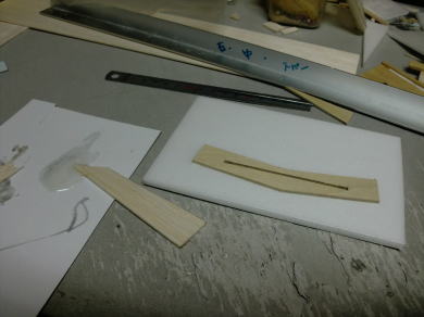 ● 加工の仕方ですが・・・後縁側の薄い方をリブの下面として翼型に削ると、翼の上面は立体上で前縁から後縁まで厚みが変わって行きます。しかし、此れは・・・見た目の厚みの変化であり、基本的には削りを入れる前の断面がテーパー角度の部材の角度の変化はありません。この状態のままインナーウィングとアウターウィングの結合木口に貼り込めば、外翼の上反角設定が決まります。