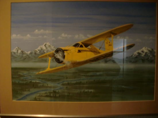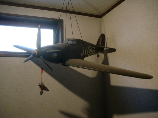 ● この画像はトムさんの豪邸に展示してあった機体と絵画です。左の軍用機はホーカーハリケーン。何処となくB型ムスタングにも見えるが、全くの別物、イギリスの名機です。スピットファイヤ同様にバルサキットで販売したらしいが、あまり人気が無く数は多くないとの事だが、今見るとかなり斬新な形状ですな。絵画の機体は過去のラジコン技術誌のモデラーの自作記事として掲載されたもの・・・。(ビーチクラフト・モデル17・スタッガーウィング)という機体。製作記事中のメインストラットギヤの収納に大変苦労したと記載してあったのを覚えている。あまり問題無さそうだけど、機首が短いので重心位置の関係上、機首側にメカを集中させたので引込脚のタイヤ収納に支障が出た。そこで、パイロン機用の薄いタイヤを使ってギリギリの収納と成った模様。