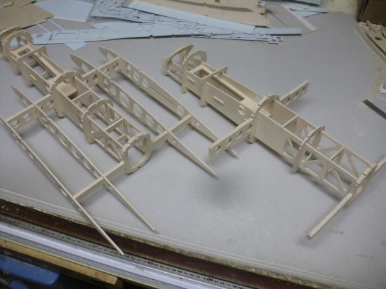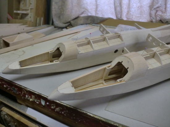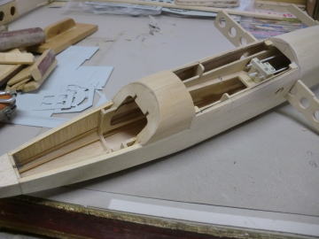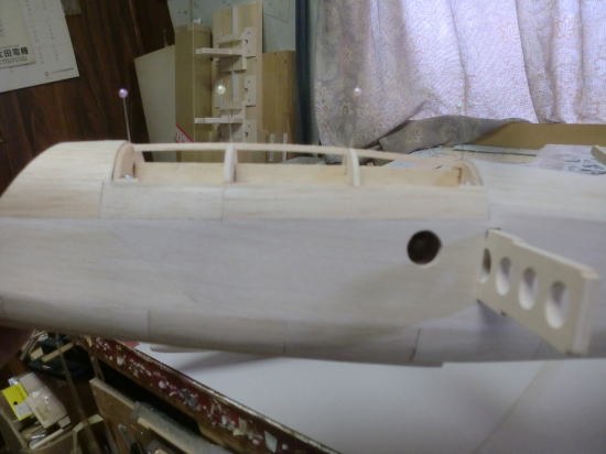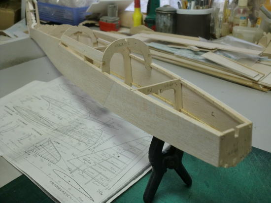 ● 段々とカタチに成って来ましたね。まだ、もう少し作業が進んでからバラす予定でしたが・・・。この当工房オリジナル構造のヴェガなんですが、かなり特殊な作業手順となってます。言い換えると、胴体が完全に組み上がってから主翼の製作に移行しても何の支障も出ないんです。山本オリジナルヴェガの場合は、胴体と一体化するセンターウィングを組み込まないと、胴体のプランクが不可能だったんですが、本機の場合・・・その山本機の工作手順の複雑さを簡素化出来る構造に成ります。もし・・・この新構造のヴェガがキットに成った場合・・・多分、モデラー自身も新しい扉を開く事が出来るでしょう。従来のバルサキットではあり得ない工作手順だと自負してるんですけどね。