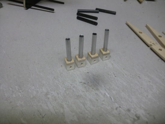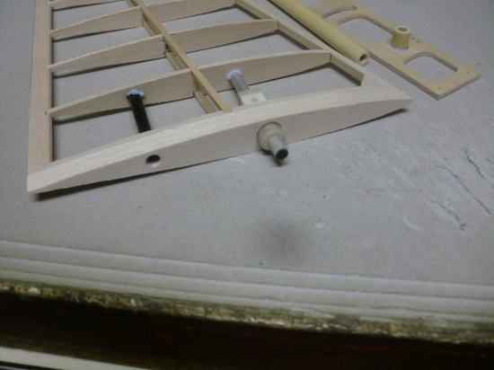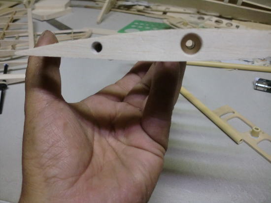 ● 綺麗にシャフトの孔の芯出しが出来てます。滅茶苦茶単純な調整手順です。軸受けパイプは外ズラが長さ10mm有るんですが、この軸受けパネルは穴だらけなので、外側に1mmバルサを貼り込む予定・・・。それで、垂直尾翼のプランク面とツライチに成ります。よって、パイプの長さは9mmに減りますが、スタビ側も9mmの深さが有るので、1mmの空間を設けても、隙間は1mm位で調整できます。まあ、其の為のストッパー機能なんです。