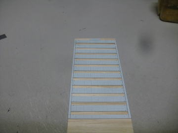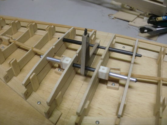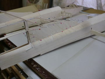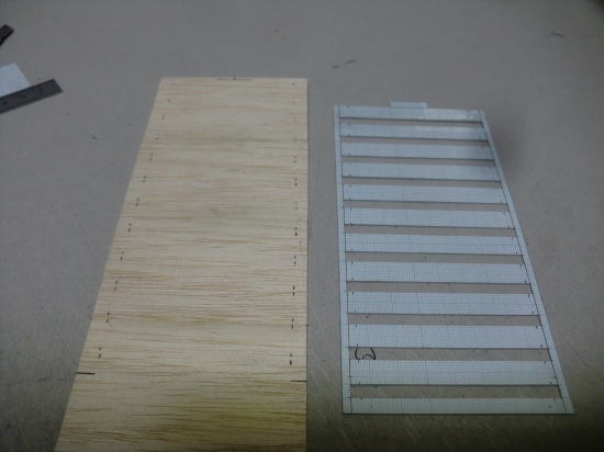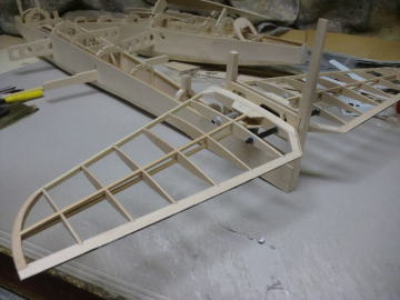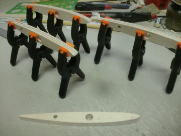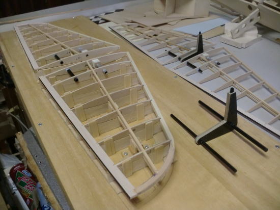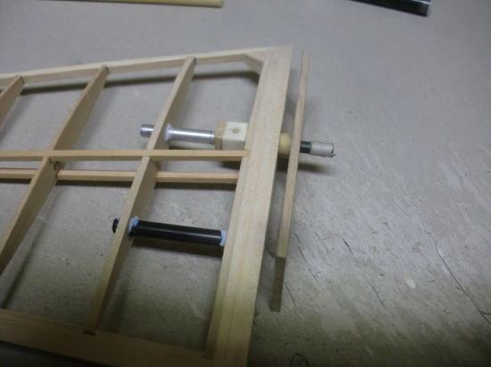 ● 初号機のスタビライザー組み立てで使ったリブ組み治具が再度活躍してます。まずは(S1)と(S2)のリブをセットして、前後二つのパイプの位置を正確に決め接着します。此の際・・・クランク板もセットした状態で行います。次にメインスパーと成る3×3mmのヒノキ棒もセットした状態で、木工ボンドをリブのスパー溝に塗り込みながら組み込んでいきます。前縁はスロット加工した5×5mmのバルサ・・・後縁は3×10mmのバルサシートを貼り込んでいます。接着剤が硬化したら治具から外して、前縁と後縁を正規の形状まで削る作業を行います。