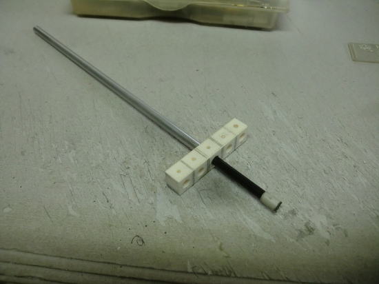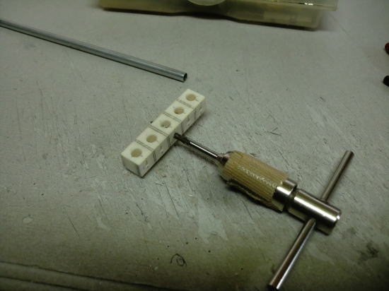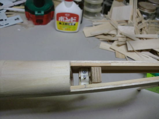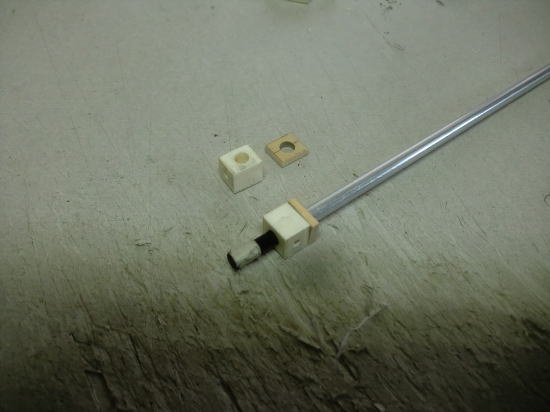 ● この小さいブラケットは、リンケージのアウターパイプを固定する為の部品です。PVC樹脂の角材を削って作りました。此れを胴体後部・・・クランク板の駆動アームとアジャスターで連結します。ブラケットの真ん中の2mmのビスは、多分・・・トムさんの指でもこの空間には入りません。よって、もし・・・ブラケットが外れて隙間に落ちる前にロングノーズ・プライヤー(所謂ラジオペンチの事)で摘まんで、引っ張り出す為の小技ですよ。何度も苦汁を舐めましたしねえ・・・其れはトムさんでも起こり得る事態・・・。多分、メールでボヤくでしょう。