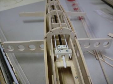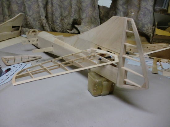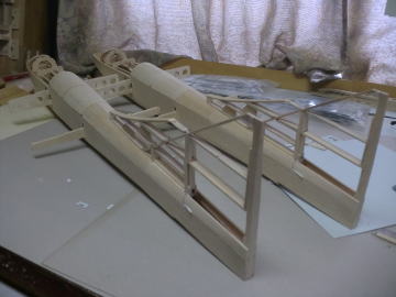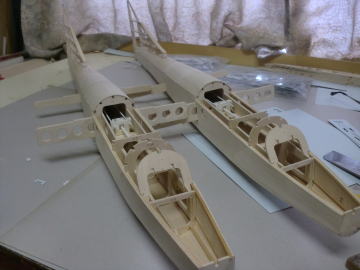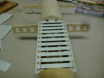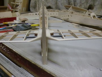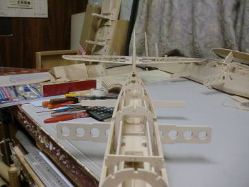 ● フライングスタビの取り付けは画像の様な案配・・・。作業の工程を少し語るとすれば、胴体は下部のみプランク済みです。さて・・・垂直尾翼は何時組み上がるのか・・・。其れにはまず・・・ラダーリンケージの部品とエレベーターリンケージの部品を先入れしないと、後からは入れられないんですよねえ・・・。そして、胴体上部のプランクです。この胴体上部のプランクの上に、あの複雑な垂直尾翼の部材が載っていくんです・・・。垂直尾翼の骨組み完成と同時にスタビクランクの挿入と軸受けパネルの接着・・・。そして垂直尾翼の全面プランクと成ります。ラダーの部材を組めば胴体は完了って所ですなあ・・・。