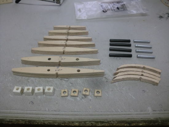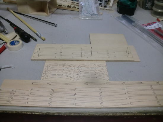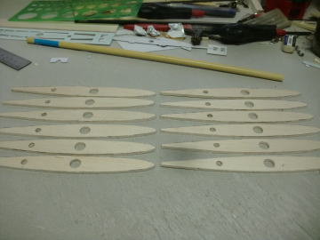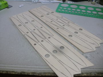 ● フライングスタビライザーを組立てます。トレースしたのは初号機の形紙を使って作図しました。(S1)と(S2)のリブは3mmベニヤなので、二枚重ねて釘で留めて糸鋸加工しました。(S3)~(S7)までのリブは2mmバルサ・・・ボールペンでトレースして一枚ずつカッターナイフで切り抜きました。翼端側のウィングチップ材は、2mmバルサから形紙でトレースし、3枚重ねて接着し・・・一個分のパーツとしました。画像の切り出したパーツ類は全て二機分切り出して有ります。勘違いなさいませぬ様・・・。