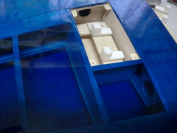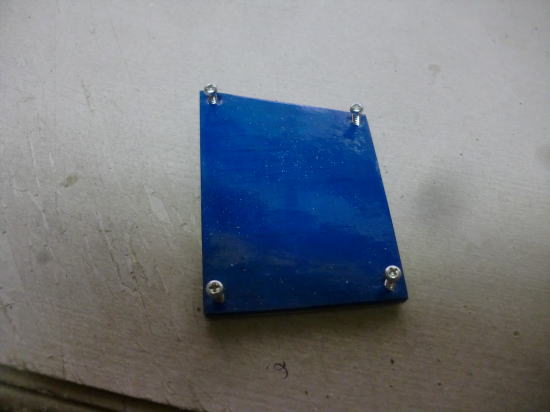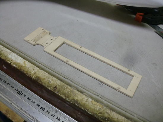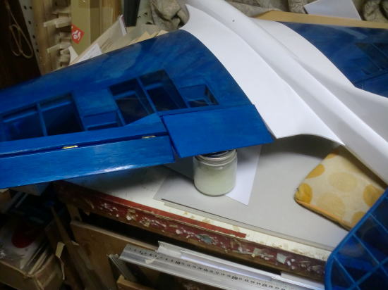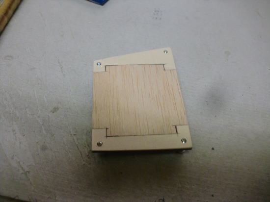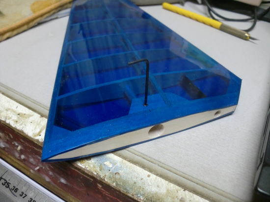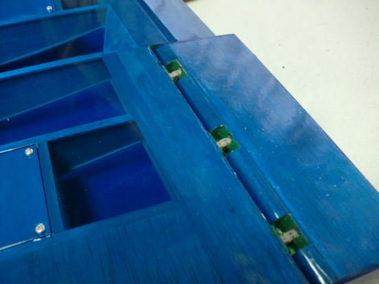 ● 画像は主翼内蔵駆動サーボのハッチパネルです。バルサ素地の面が裏側・・・。上下の一部が1,5mmのカバベニヤ・・・残りが1,5mmのハードバルサです。ブルーのオラカバフィルムを貼った面が表側です。透けているバルサの木目が横目に成ってます。このハッチパネルも二層です。裏側と表側で木目の方向を変えて有るんです。サーボの取り付け位置が決まったら、このハッチに長孔の貫通孔を開けます。その際・・・木目に沿って割れない様に擦る為の工夫です。