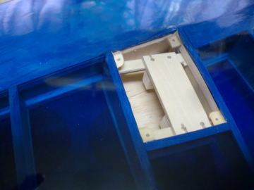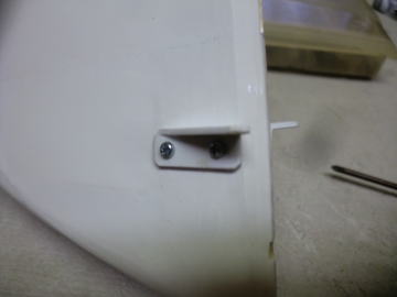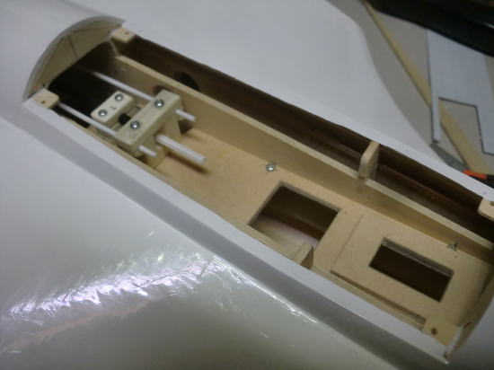 ● ラダーサーボは画像右端で、サーボの表面積よりも僅かに大きく穴加工してあり、更に高さを5mm程嵩上げしてリンケージします。この処置はエレベータサーボとのリンケージの際の干渉を防ぐ為です。リンケージロッドを保持するブラケット等も、高さを5mm変えて配置してあります。エルロンサーボとフラップサーボの延長コードを通す際は、ブラケットの蓋を外し、更にサーボプレートの固定ビスも外すと、プレート本体を抜き取る事が出来ます。延長コード等の取付が終われば、今度は逆の手順・・・。そんなに難しい作業でも無いですよ!トムさん!。