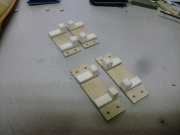 ● 主翼に搭載するサーボマウントを作ります。画像に見えるマウントのベースは、1,5mmカバベニヤを二枚積層してあります。白い部材はPVC樹脂のサーボ固定ブラケット。ねじ山を作るには、取り付けビスよりも細いドリル刃で下孔を開け、サーボ取り付けビスを捻じ込むという手順です。画像中央はエルロンサーボマウント配置。画像では下に成っていますが実際には上に成ります。主翼側も1,5mmカバベニヤの二枚積層台座です。右画像はフラップサーボの配置画像・・・。今度はサーボが上向き、実際には下向きとなります。