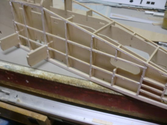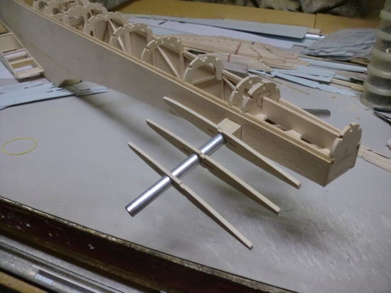 ● フライングスタビのリブ材は全部で8枚使います。此れをカンザシ受けのアルミパイプ一本で支えなければなりません・・・。ひ弱な材質と構造では駄目なんです。胴体側のリブ3枚は3mmベニヤで構成してますが、4番リブから翼端側の8番リブまでは2mmのハードバルサで構成しています。プランクシートはVEGA同様に有りませんが、多分フィルムを貼り込んだら驚くほど頑丈なスタビに成ります。更に比較的軽量です。
