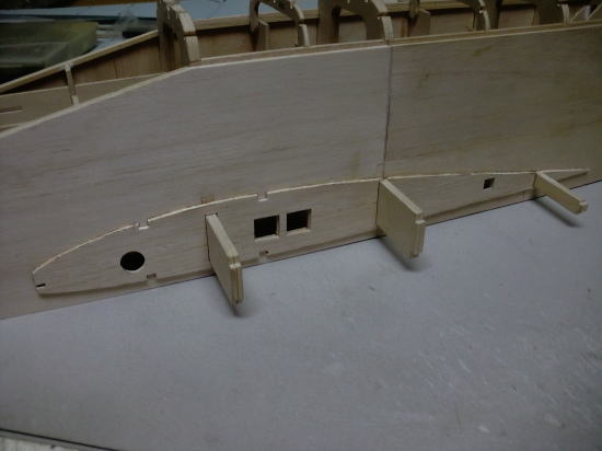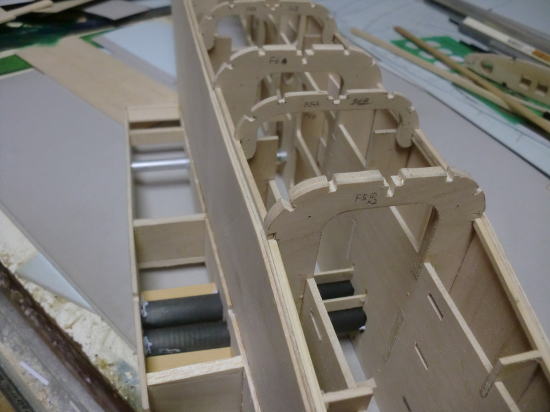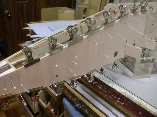 ● 胴体側面への貼り込みには木工白ボンドを使いました。リブの周囲をマチ針を刺し込んで仮止めし、硬化を待ちましょう。胴体側面のカーブに合わせてリブも湾曲して貼り込んでますが、カーブした分寸法が短く成るので、正確には貼れてないのですが、リブの前後で其々0,3mmほどしか短く成りません。よって、テーパー比率に合わせて作図し、普通に貼り込んでも支障は出ません。しかし、其れでも綿密では無いので、その辺りが目について許せない!って思うモデラーさんは、別のもっとハイテク機器を使って正確に切り出して貼り込みましょう。