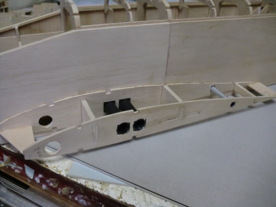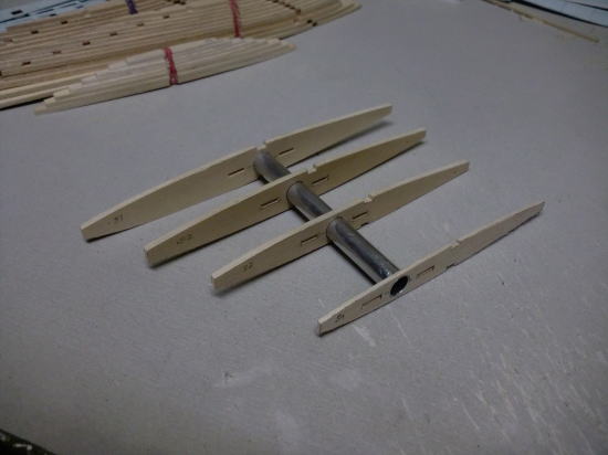 ● 実際にパイプを通して、位置を確かめてからパイプを固定しています。画像の場合はまだ瞬間接着剤によるパイプの仮止めの状態です。パイプ横の補強板は3mmのヒノキの平材を同じく瞬間接着剤で仮止め程度に貼り込んでます。最終的には目張りをする様に、周囲の隙間を埋めながら作業を進めて行きます。別にパイプのみを接着剤で固めても良いんですが、此れは私の個人的な好みです。