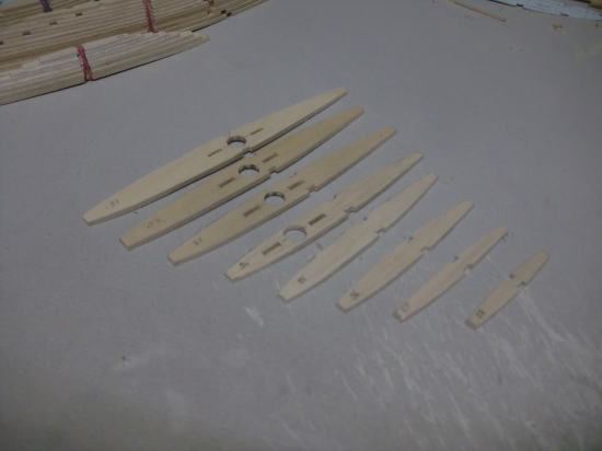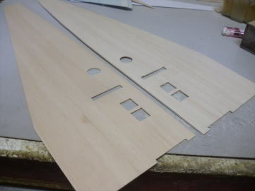 ● 前部胴体側板の工作を行います。画像の其々対の側板材の厚みは1,5mm・・・。厚みは同じですが木目の方向が其々対で違います。本機の胴体の側板は、重心位置付近で前部胴体を3mm・・・後部胴体を2mmで構成しています。厚さ3mmの側板材を500mm程の区間で、半分以下に絞るのは大変難しい・・・。胴枠に確実に貼り付けるには聊か難儀ではあるんです。仮に厚みが1,5mm・・・しかも、木目が縦目ならば、このカーブにも柔軟に対応できます。二層目は正規の横目に成るので、仕上がりの違和感は起こりません。