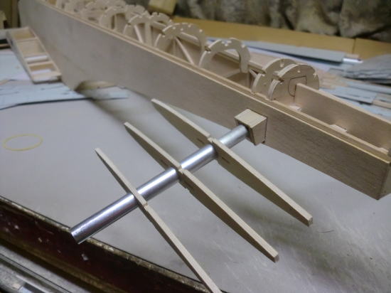 ● と言う事は、カンザシ固定のパイプ孔の位置も同じ位置に開きますので、内部側板面に360度方向で直角に通る事になります。二枚の内部側板を貫通したパイプが基準と成りますので、三本のパイプカンザシも正確に固定する事が可能なんです。後から細かく削って調整するのは他の貫通部材・・・。ね?・・・難しく無いでしょう・・・。実際、組立てる部材の中で一番骨が折れ、神経もストレスも溜め捲ってるのがこの部分の工作です。此処から先の部材の加工と取り付け・・・かなり楽しく組めそうですね。