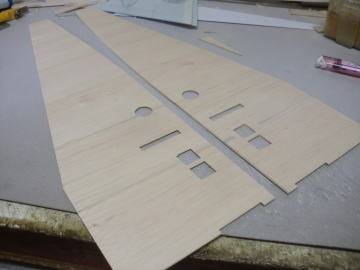 ● 縦目と横目の貼り合わせの合板にする側板材は、ある意味頑丈な側板材と成るんです。更に間に塗り込む接着剤がある程度の重量物にも成るので、テールヘビーの軽減にも役立ちますし、強度の高い構造体にする事が出来ます。骨の要る加工には成りますが、仕上がる胴体の構造体が大変頑丈であると共に、作る手順において・・・作り手が納得した上での作業を進める事が出来るので、ストレスの軽減にも役立ちます。