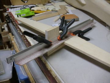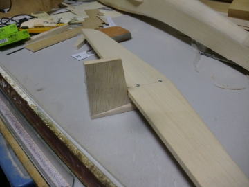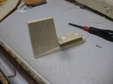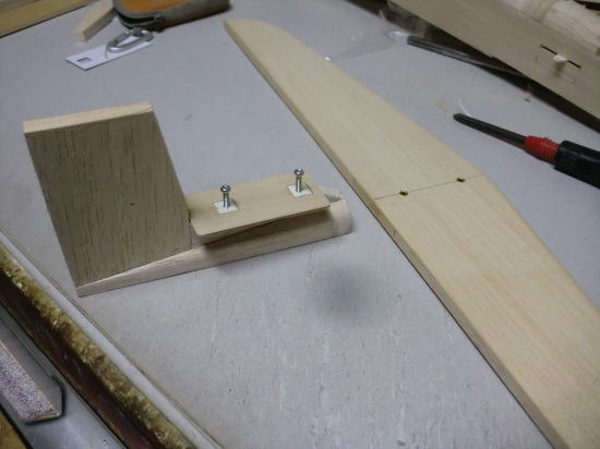 ● 尾翼ユニットの工作です。水平尾翼を載せるベニヤの台座を、垂直尾翼の前方の所定の位置に接着します。要は垂直尾翼に正確に直角に水平尾翼を固定出来れば言い訳だから・・・厚みのあるアルミのアングル材で垂直尾翼と水平尾翼をクリップで挟んで固定します。このベニヤの台座と水平尾翼はビスで固定された状態・・・台座の裏側にはPVC樹脂のブロックが接着されています。このブロックを含む台座の裏側を垂直尾翼ユニットの前方の所定の位置に、クイックメンダー(速乾のエポキシ接着剤)で固定しました。