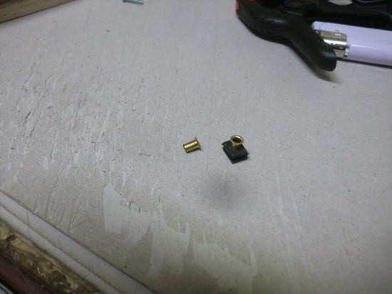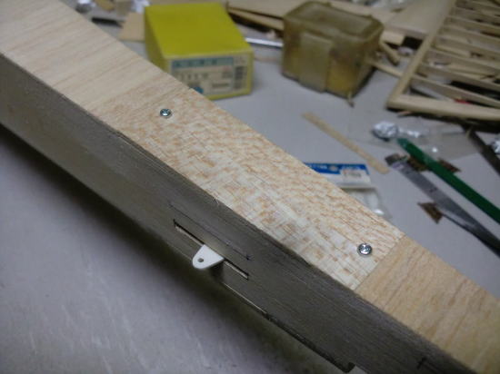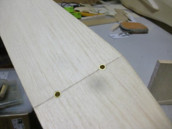 ● 水平尾翼の台座への固定には3×15mmのビスを使います。水平尾翼は粗全てがバルサ材なんですが、固定するビス孔が何れ摩耗する事も考えられるので、金属の段付きスリーブを埋め込みました。此の金属スリーブの正体はサーボモーターセットに付属のパーツです。サーボ固定にはベニヤ製のベッドにタッピングビスで締め付けるのが定説です。この部品の内径が3mmのビスに対応していますので、今回使ってみました。このスリーブはまだ接着していません。被覆が済んでからはめ込みシャブシャブの瞬間接着剤(OK模型のBW等・・・)で固定します。