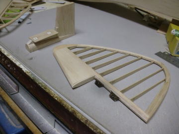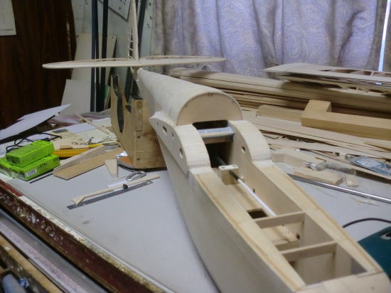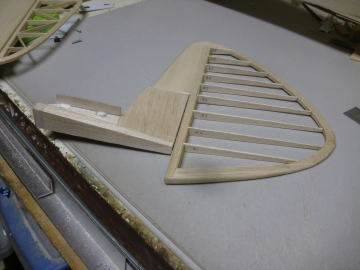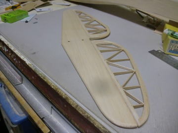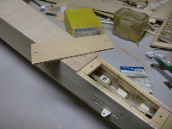 ● エレベータのロッドエンド機構部分のハッチを作りました。上部と下部の両方にハッチが有るので、後部胴体がひ弱に見えますが・・・内部構造部品が複雑に胴枠間を固定しているので、見た目よりも頑丈です。両方のハッチを外して胴体を掴んで捻ろうとしてもビクともしません。最初からこのハッチの両面解放を決めて有ったので・・・後部胴体の内部構造体を作って組み込みました。ソフト寄りのメディアムバルサで組んだ構造体ですが、僅か6グラムの構造体でも3mmバルサの集合体ならば、内部補強は充分だと思います。