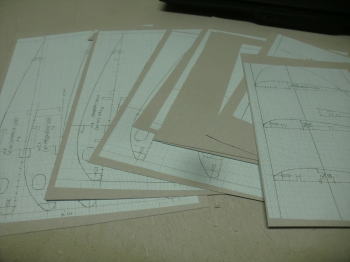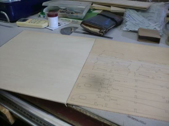 ● 取り敢えず・・・現在仕上がってる形紙のみトレース完了です。ベニヤ部材は3mmと2mmから・・・バルサ部材は2mmと3mmから・・・。此れを切り出すのにまた一苦労・・・。でも其れを楽しくやっちゃうのがラジ馬鹿の良い所とも言えますなあ・・・。こんな面倒臭い事やってらんねえネットの便乗組モデラーさんからは、小馬鹿にしたような見下しオーラが感じ取れますなあ・・・。別にラジ馬鹿でも良いじゃないですか。筋金入りのラジコン馬鹿を自称してますから・・・。メインの主翼のリブ材は片翼25枚です。ベニヤと3mmバルサの数枚分のリブ以外は、全て2mmバルサシート2枚分に収まっています。バルサシートのサイズは80×900mmです。