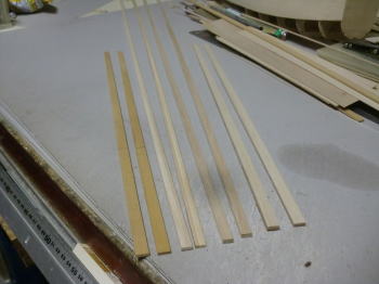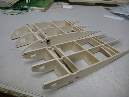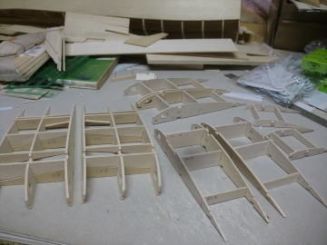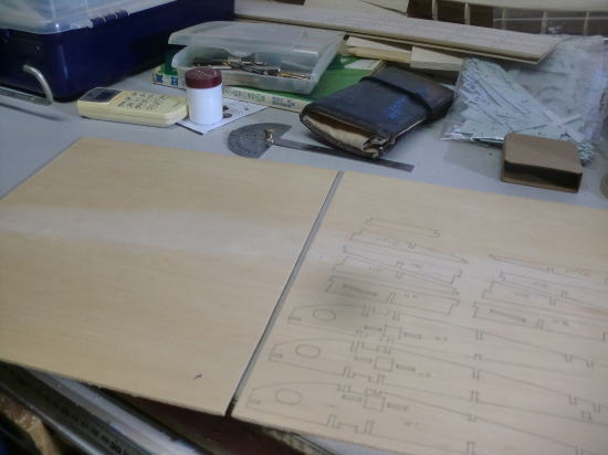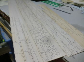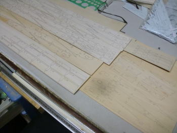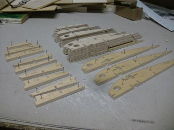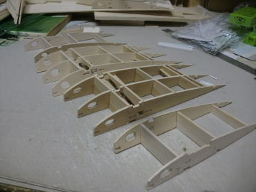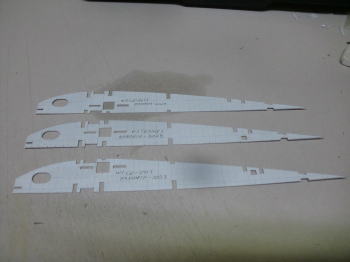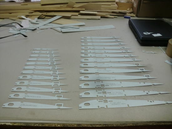 ● 世の中・・・お天道様が急接近したんじゃねえかって位に猛暑の最中、工房二階の工作室に週末二日籠ってリブ材を切り出す事に専念・・・。本日日曜日、やっと50枚を越える本機のリブ材を切り終えました。ああ、疲れたァ~・・・。まだまだ切り出す部品は、後三日は掛かるかなあ~・・・。本機の片翼分のリブ材は26枚もあり、更に補助リブやら補強部材も含めると60枚分を切り出した事に・・・。