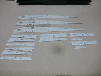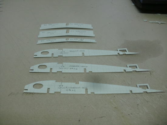 ● 週末二日を使って、やっと主翼のリブ材の形紙を切り抜きました。まあ・・・この作業が新作機の製作には必ず訪れる一種の行事みたいな物なので、急ぐ機体でもないし・・・急いでポカるよりは確実に切り抜ける様に心掛けました。此れだけ切り欠きの多いリブ材なので、切り間違いに気づかず組立中だったら其の落胆は後悔マックス、暫くは作業が止まる可能性もマックス・・・。よって歩みはノロいが危ない橋は渡らないのが私の持論です。此れも経験値・・・。