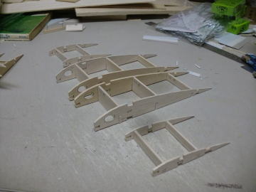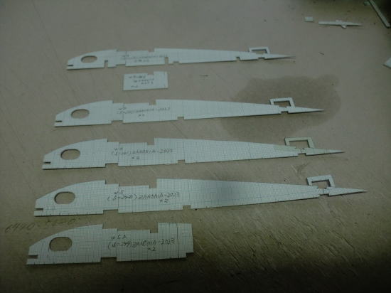 ● リブ材の切り出し中です。今回の製作コンセプトの一つは、大掛かりの組み立て治具を使わない点にあります。むしろ、昭和のダイカットキット・・・令和のレーザー加工キットにも組み込み可能な工法です。画像の部品は翼根側のカンザシ受けパイプを組み込むユニットになります。部品の数が聊か大袈裟に見えますが、此れも内翼9度というガル翼特有の設定の為・・・更に、此処が主翼の付け根として荷重が最も大きくなる場所ですので、其れなりの複雑な構造物とは成り得る訳です。リブ自体にも多くのスロット加工を行っていますが、材質が3mmベニヤなので、近接した切り込み部分も欠ける事無く仕上がるでしょう。此れも経験値・・・。