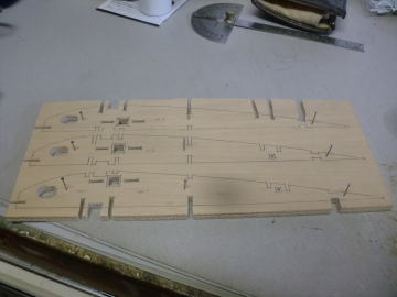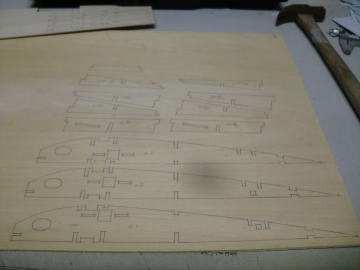 ● 左側画像は内翼(center wing)と外翼(outer wing)のジョイント部分・・・。ゲージと成るジョイント板は繋がってますが、何れ切り離されます。切り離して単独で組立てます。このジョイント板には、其々角度を付けたスロットイン形式となっており、三枚のジョイント板が全て平行に・・・更に二枚のリブ材との接合面を直角配置とするのが一応の正確な完成形となります。画像右側は外翼の翼端側ですが、二枚のジョイント板がリブ材に直角に取り付き・・・更に二枚が平行なら正確な完成形となっています。さて・・・形紙の次は材料へのトレース・・・。一部糸鋸作業になるので、来週末の作業に成りそうです。