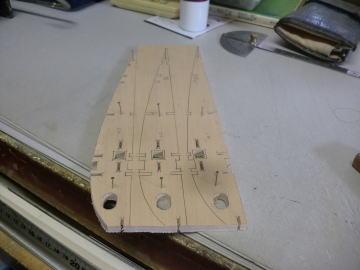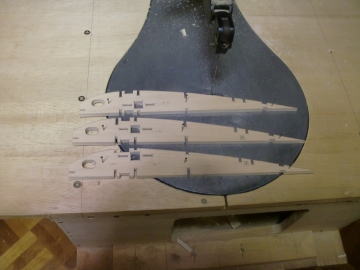 ● まあ・・・糸鋸加工に関しては、モデラー其々の加工手順も有るでしょうから、当工房の主な手順を紹介しておきましょう。まずは三枚つづりのベニヤリブの切り出し手順なんですが、周囲10mm以内なら、画像の様に溝彫り部分のみを先に加工して抜いてしまいます。場所によっては数ミリ程度しか間隔の無い所も有るので、画像の様な抜き方の方が強度を保ったまま加工する事が出来ます。その後翼型に沿って糸鋸で切り出すんですが、短い距離の切り抜き加工なので、鋸刃が膨らんだり・・・基準線に食い込んでしまったりが無いんです。要するに、リブの周囲を先に抜き加工してしまうと、部材自体が細く長く成るので場所によっては強度が極端に落ちてしまう場合もあるんです。よって細く狭い箇所の溝彫り加工の際に、部材の一部が欠けてしまう事もあり得ます。