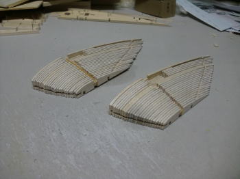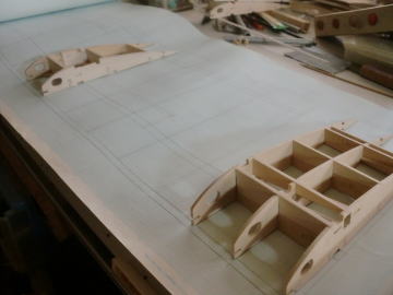 ● よって、巾8mmから5mmまで細くなるヒノキ材をどうやって正確に削り込むのか・・・、ハッキリ言って、この作業は拷問にも似てますし・・・必ず削り過ぎて歪に成りそうな予感も有ったので、表面を削り易くする目的で1,5mmバルサ棒を追加で貼り込んでます。さて・・・本機のリブ組みの手順、二枚もしくは三枚のリブがユニットとして組み込まれるんですが、片翼の両翼端は正確にメインスパーと直角配置・・・両翼端は並行配置・・・此れなら原寸図面上でも正確に組立てられますなあ・・・。中身のリブは少々歪んでいても、最終的な胴体との結合にも修正無しで合体完了・・・。当工房のオリジナル工作法の一つです。余計な部品は増えてますが、個人の正確さを期する為のオリジナルなので、絶対に真似せよとは言えません。当工房独自のカスタム機製作上の・・・見えない手抜きとも言えるからですよ。まあ・・・良い意味での手抜き・・・でしょうなあ・・・。(Part-7に続く)