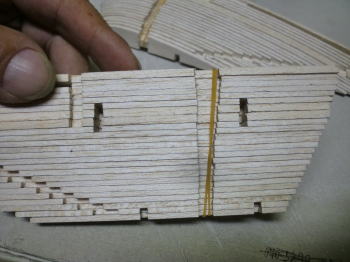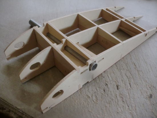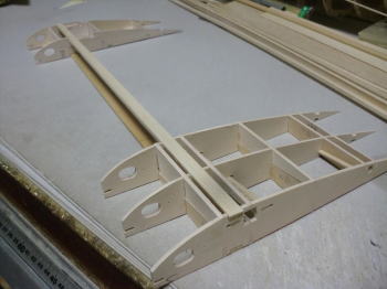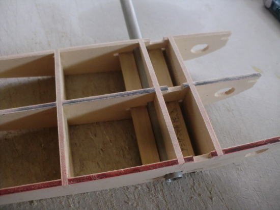 ● 実際に接着剤を入れてベニヤユニットを組み立てました。カンザシ受けのパイプの上下は3mmベニヤで押さえ・・・前後は2mmのカバベニヤを使ってます。上下の押さえはともかく・・・前後の押さえはどうやって入れたの?って思ってる方、胴体側のカンザシ受けパイプの固定方法と同じです。ただ、今回はリブ三枚の貫通なので、見た目の構造がypく解りませんでしたね。リブ側面の細くて長い孔は内寸2×10mmあるんです。部材の幅は9,5mmでリブ三枚分とピッチ分の長さがあり、其々3×3mmの切り欠きを入れて、部材の挿入後にパイプ側にズラせばロック完了・・・。当然リブの細い孔には隙間が出来ますが、其れも気に成るんだったらバルサ片を詰めて埋めれば良いんじゃないかな?・・・。