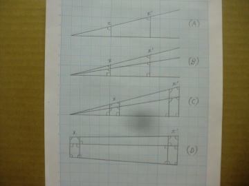 ● 大掛かりな主翼組み立て治具を作らず・・・義務教育9年間で習った幾何学の法則を使って正確に組める手順を紹介していきます。イラスト画像の(A)は、任意の角度の大小二つの三角形は相似であることを示しています。これ位なら誰でも覚えている筈です。(B)は此れに一本の線を加えてみました。二つの三角形の内接する其々の角度は全部同じ角度です。此れには決まり事が一つだけ・・・、上下の二本の線に交わる縦の線は平行である事。平行ならば斜めに交わっていても良いんです。