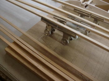● 更に上下のメインスパーは厚みが違うんです。上面の方が1,5mm厚くて4,5mmに成ってるんです。此れは本機の主翼がラムロット改と成ってるからなんですが、一条さんの構造をリニューアルすると、結果的にこういう事態に成った訳で・・・。一条氏オリジナルのザノニアの主翼構造は、メインスパーとカンザシ受けのパイプが並行配置なんですが、此れを確実に翼端まで維持するには、翼端側のメインスパーは厚み3mmでは採れない事が判明・・・。その原因は、比率である翼型の取り付け位置から後方にズレたから・・・なんですが、この翼リブの其々のカーブが、前後で出っ張るからなんです。よって、上面のプランクシートを貼り込む前に、厚さ3mmのヒノキの上面を、リブに合わせて全部アール状に削る必要が出たんです。
