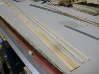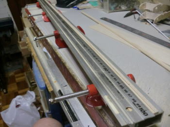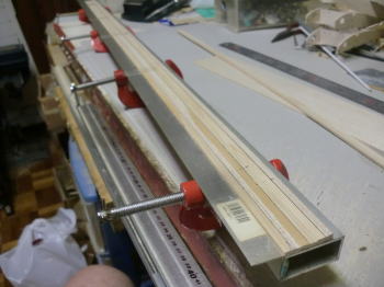 ● 本機外翼のメインスパーはスパン1060mmで、(9)番の結合リブ直下で巾8mm・・・翼端で5mmと成る様に削りを入れて有るんです。スパーは合せ木細工の構造なんですが、繋いだ3×5mmのヒノキに3×5mmのバルサを接着して3×10mmとし・・・、バルサ側を斜めに落として形成してあるんです。内翼も同様にテーパー状に削りを入れましたが、此方は3×10mmのヒノキを加工しました。1000mm以上の巾10mmの棒材に斜めに線を引く?・・・定規を使うにしたって正確に引けるのか?って疑問・・・。こうすりゃ好いんですなあ・・・。3本繋いで巾30mmにすれば、段付き無しの平面状態なので、長さ1000mmでも斜めに直線は引けるんですよ。アルミの角パイプとアングル材の長さは2メートルあるんで、当工房の片翼スパン1900mmのライハーもメインスパーは此の手順のテーパースパーを組み込んでます。