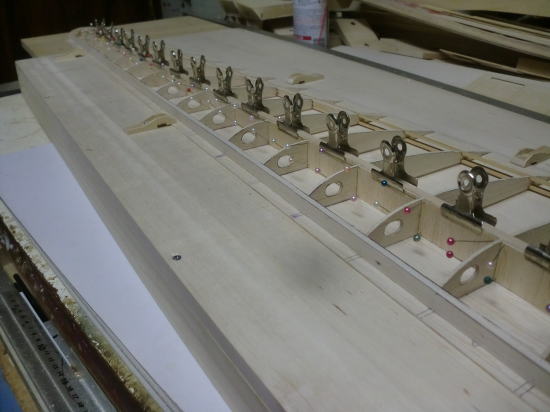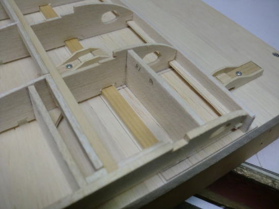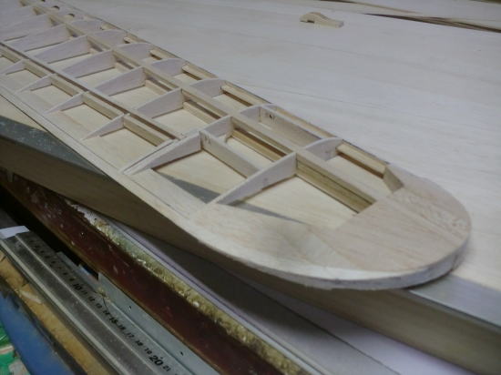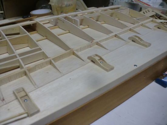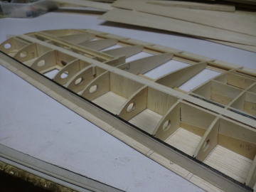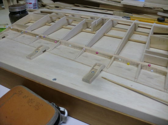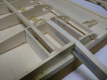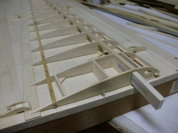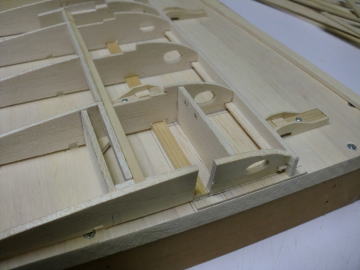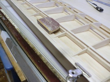 ● 此方は内翼の後縁側です。この補助部材の高さは僅か8mm・・・。ところが、この部材在るのと無いのとでは強度の差が大きく変化するんですなあ・・・。上面プランク無し状態の現在・・・翼の両端リブを掴んで捻りの力を加えると、明らかに捻り難い・・・。要するに、捻じれた状態でこの補強部材を入れてしまうと、元に戻せなくなるという危険性も在るって事。今回、このリブ組み状態を大掛かりな治具を使わず、誰にでも作れるだろう工作台レベルの定盤上で組んでます。このレベルでも使わないよりはマシなんだが、ほぼ正確には組立てられています。