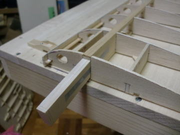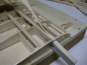 ● 本機のメインスパーはテーパー仕様なので、ジョイント部分の9番リブよりも8番リブの方が幅が広いです。よって上面のプランクを終えて、スパー前後に補助スパーを張り付けてしまうと・・・、この特殊形状のジョイント部材は取り付け不可能に成るんです。何故ならジョイント部分の9番リブのメインスパー巾よりも8番リブの巾の方が広いからです。常識で考えても後からは挿入不可能です。