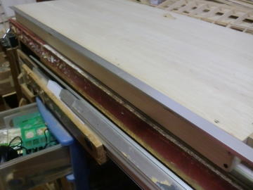 ● 定盤の部品を全部外して・・・側面にアルミのアングル材を取り付けます。今から行う加工は主翼下面に貼り込んだ後縁材(1,5mm)の最後部を斜めに削ります。主翼リブ型の後縁側斜角に合わせて削りを入れますが、大体の厚みは0,5~0,3mmを目安にしています。何故なら・・・上面にも同じ1,5mmの後縁プランクを行うので、なるべく後縁先端を薄くする為です。目標は1,5mm・・・。貼り込んだ後、上部プランクシートを0,3mm程度は落とす事になるでしょう。其の為の厚みのある(厚さ2,0mm)のアングル材を取り付けてあります。後縁先端を黒く塗り潰すのは、目視で削り度合いを観る為です。