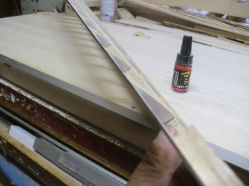 ● 此方は外翼側・・・。カンザシを内蔵する為の調整中です。此方外翼側はメインスパーの前後に補助スパーを貼り込んでボックス状態に加工しなければなりません。隙間無くキッチリと収まるボックスにする為には、其れなりのシビアな調整が必要です。この面倒臭く無駄とも思えるカンザシ受けの内部構造を好い加減に作ると・・・西の大国の完成機と同じ結果と成るんですなあ・・・。幾らカンザシ本体が頑強な造りであろうと・・・そのカンザシをエポキシ溶剤をはみ出るほどにたっぷり盛り付けて硬化させようとも・・・このカンザシ受けの内部ボックス構造がひ弱な状態なら、全速力での宙返りの最中に、主翼が荷重に耐えきれず根元からバンザイしてしまう可能性もある訳ですよ。