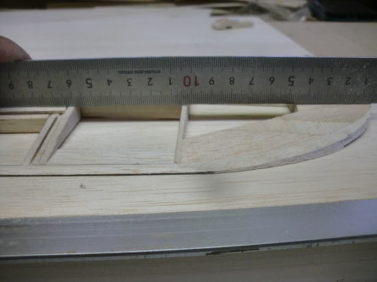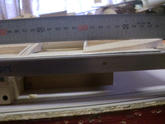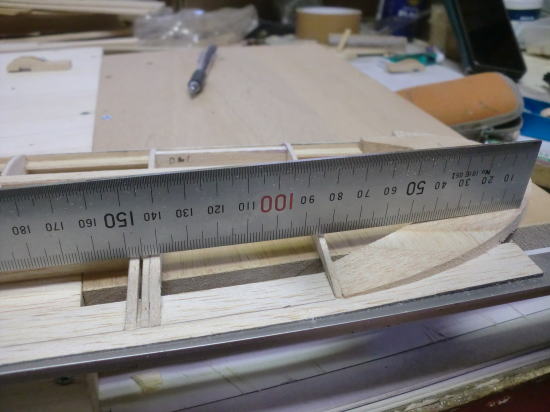 ● 中身の抜けた翼端ブロック材は、特に楕円の場合・・・基準が中々採れません。その場合は画像の様なアナログではありますが・・・ある程度の削りの正確さは出す事が出来ます。リブは全て相似形ですので、基準となる座標に定規を当てれば、ブロック側の削り度合いは見えて来ます。ブロック手前の26番リブに隙間が見えていますが、此れはまだブロック側の同位置が高いので、もっと削り込まねばなりません。リブ型の翼端ブロックでは無いので・・・削りが難しいのですが、仕上がって翼端側から見ると・・・綺麗な翼型に成っているのが解りますよ。