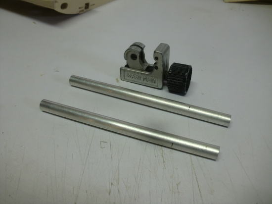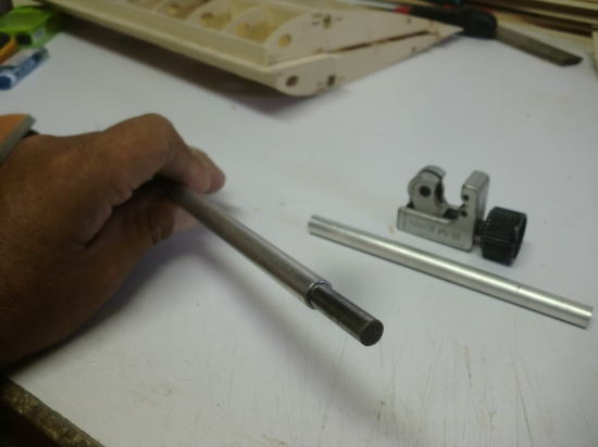 ● メインのカンザシ受けのパイプの加工です。カンザシと成るシャフトは市販のベアリングシャフト・・・。市販と言ってもホームセンターには置いてませんよ。地元の鉄工所に出向いて事情を話したら、案外スムーズに話が進み・・・取り寄せてくれたのがこのシャフト・・・。焼き入りなので少々の事では曲がりません。画像のアルミパイプも焼き入りです。アルミパイプの焼き入り???・・・。一般民間人のモデラーさんには理解出来んやろうが、パイプの材質が硬いって事は炭素の含有量が多いって事なんですなあ。アルミの性質知ってるモデラーって殆ど居ないんじゃないかな?。