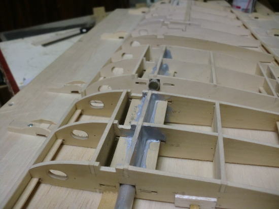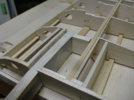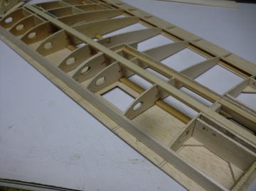 ● 内翼のリブ間補強部材取付状況です。ガル翼の内翼は荷重の宝庫と呼ばれても過言では無いと思います。今まで多くの機体を製作しましたが、翼の根元や外翼との継ぎ目からの荷重過多による破断事故は一度も起きていません。起きそうで起きないのは・・・内翼の構造が其れを物語るからです。キットを作る時、メーカーさんがガル翼の主翼構造に疎いとモデラーのバラツキのある組み立て技術に対応してくれません。モデラー自身が自作する時に、このガル翼の特性をデータとして持ってると・・・上記の箇所による破断事故は起きません。ガルモデルの数あるガル翼のキット・・・このモデラー毎のキット組み立てのバラツキに見事に対応していました。