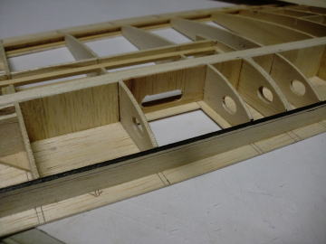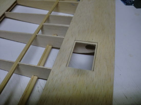 ● この角孔はメンテナンス的なハッチとして機能します。位置としてはスポイラーサーボが固定される箇所の直前です。本機の主翼には片翼ごとにスポイラーサーボとエルロンサーボが搭載されますが、延長コードが二本走るので後入れに対応させる処置です。よって被覆後にビス止めのハッチとするかはめ殺しで接着してしまうかはまだ決めていません。本機のスポイラーの駆動リンケージが従来の構造とは違うので、未だ作業手順が確定していません。